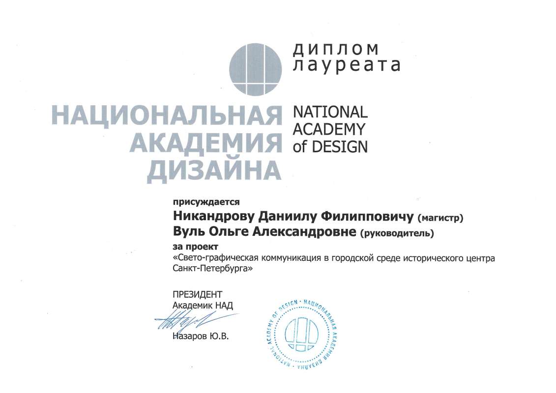 Тема дипломной работы: "Свето-графическая коммуникация в городской среде исторического центра Санкт-Петербурга". Руководитель - к.пед.н., доцент ВШДиА ИСИ Ольга Александровна Вуль.