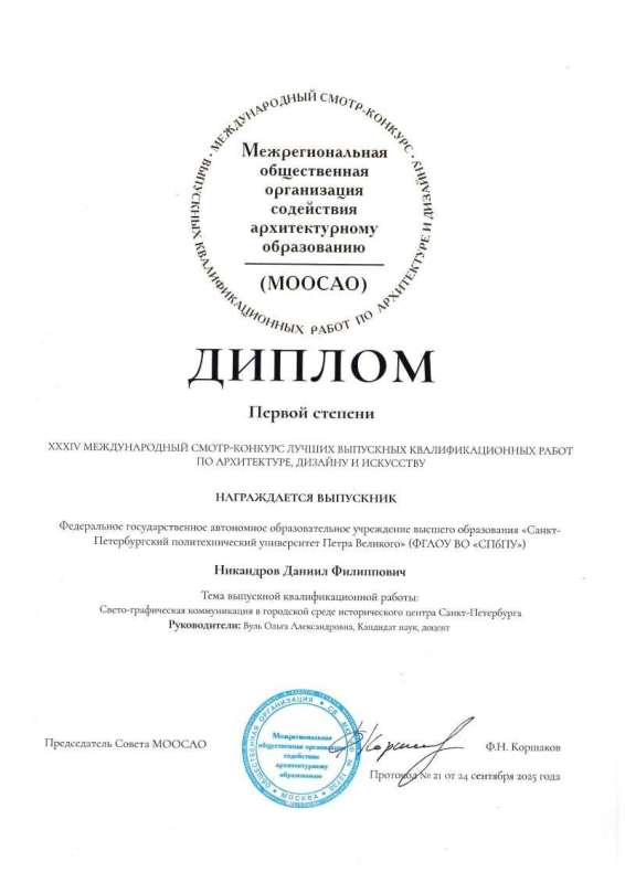 ️Магистерская диссертация Даниила НИКАНДРОВА получила диплом 1 степени и диплом Национальной академии дизайна в номинации «Дизайн визуальных коммуникаций» международного смотра — конкурса МООСАО-2025.