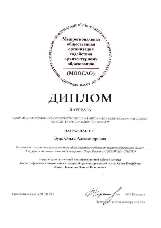 Тема дипломной работы: "Свето-графическая коммуникация в городской среде исторического центра Санкт-Петербурга". Руководитель - к.пед.н., доцент ВШДиА ИСИ Ольга Александровна Вуль.