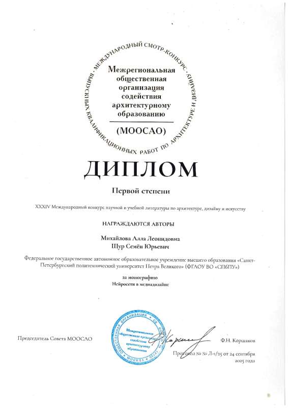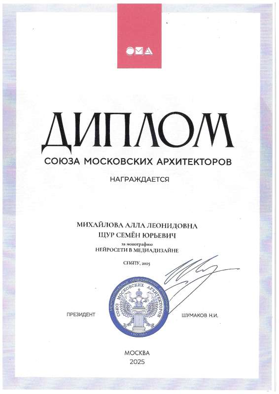 Монография «Нейросети в медиадизайне» авторов ️Михайловой Аллы Леонидовны и ️Щура Семёна Юрьевича получила диплом 1 степени и диплом Союза Московских архитекторов на XXXIV Международном конкурсе научной и учебной литературы по архитектуре, дизайну и искусству.