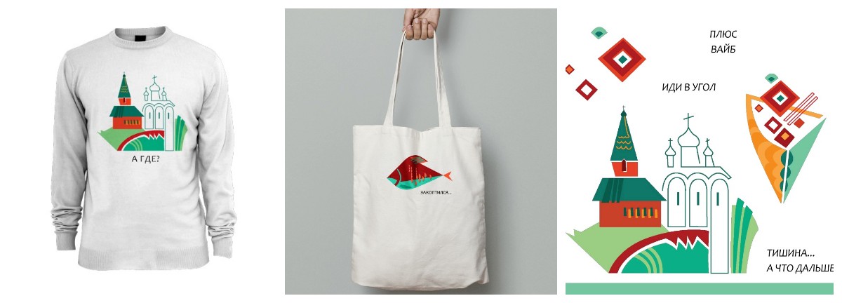 Вместе они изучали городскую среду и специфику жизни местного населения, проводили социологические исследования, узнавали у жителей, с какими символами и образами они ассоциируют Плёс. На основе собранных данных студенты разрабатывали концепции современного молодежного мерча: шопперов, свитшотов, футболок, открыток и наклеек.