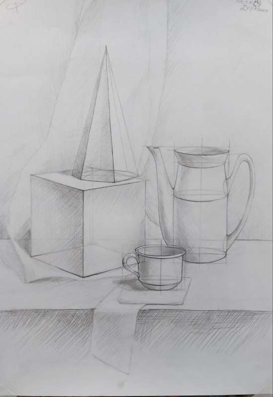 В течении семестра студентами 1го курса под руководством старшего преподавателя ВШДиА ИСИ были выполнены и представлены для оценивания работы на заданные темы : "Натюрморт", "Драпировка", "Рельеф", "Консоль" и наброски фигуры человека.