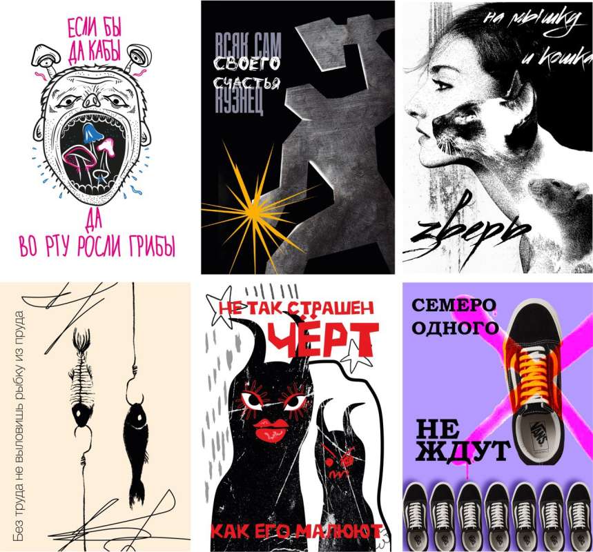 Серия плакатов к русским пословицам, конкурсный проект по литературным произведениям Петербурга;