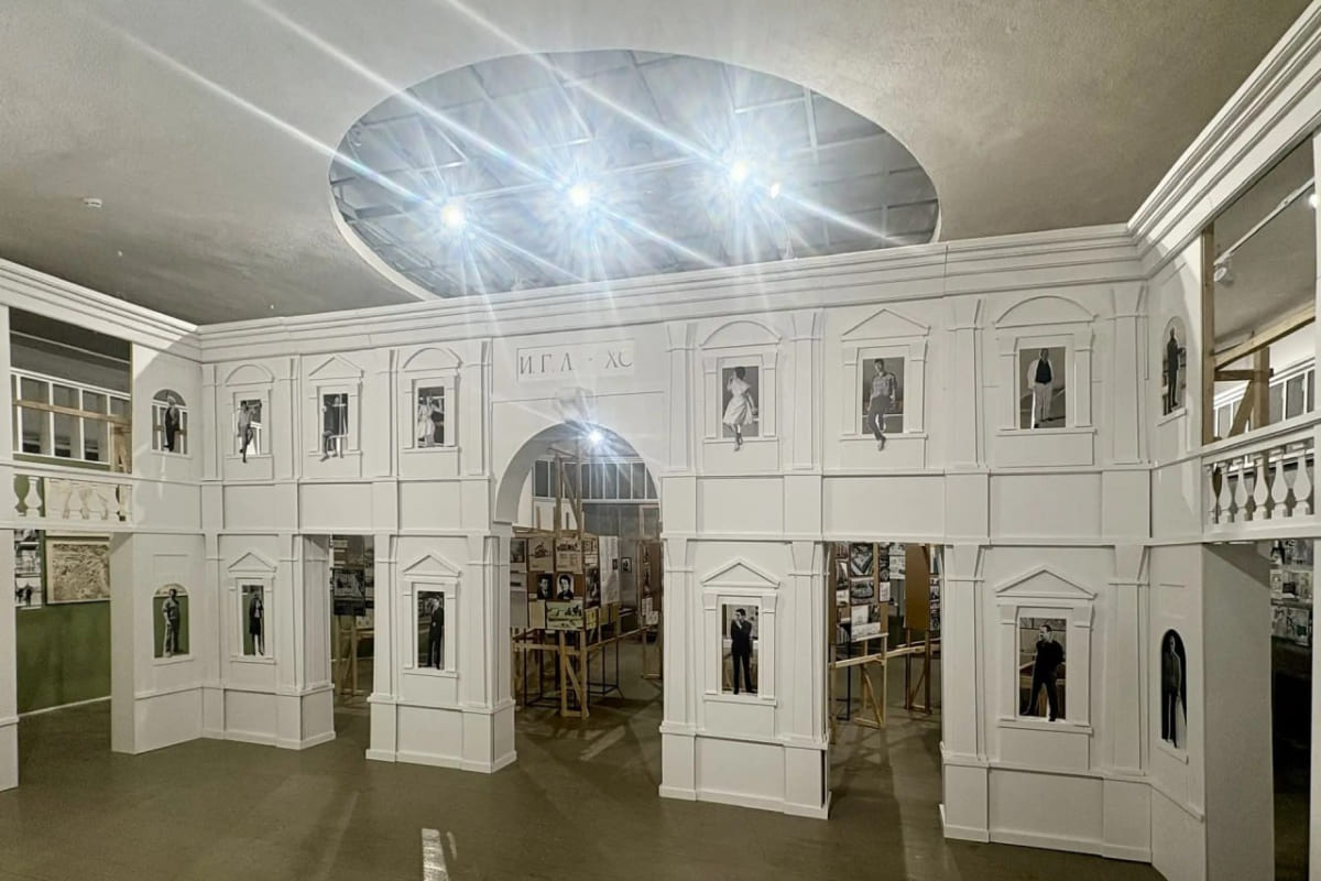 Когда посетитель заходит в выставочный зал, он оказывается перед декорациями в виде театра Олимпико в итальянском городе Виченца, любимого шедевра архитектуры Ильи Георгиевича. Эту постройку архитектор ставил своим студентам в пример, называл пространственным аттракционом.