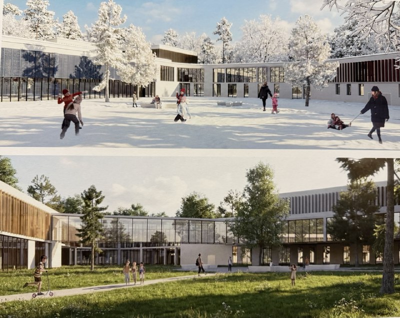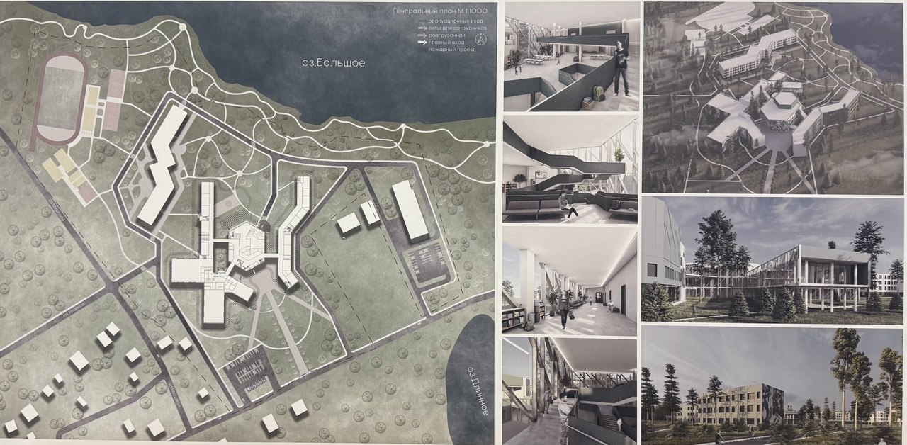 Особенность задания заключалась в том, что школа расположена на лесном участке прилегающем к берегу озера и на территории располагается уже спроектированный корпус общежития. Необходимо было организовать учебный процесс в пространстве таким образом, чтобы окружающая природа максимально визуально участвовала в жизни детей в то время когда они в школе.